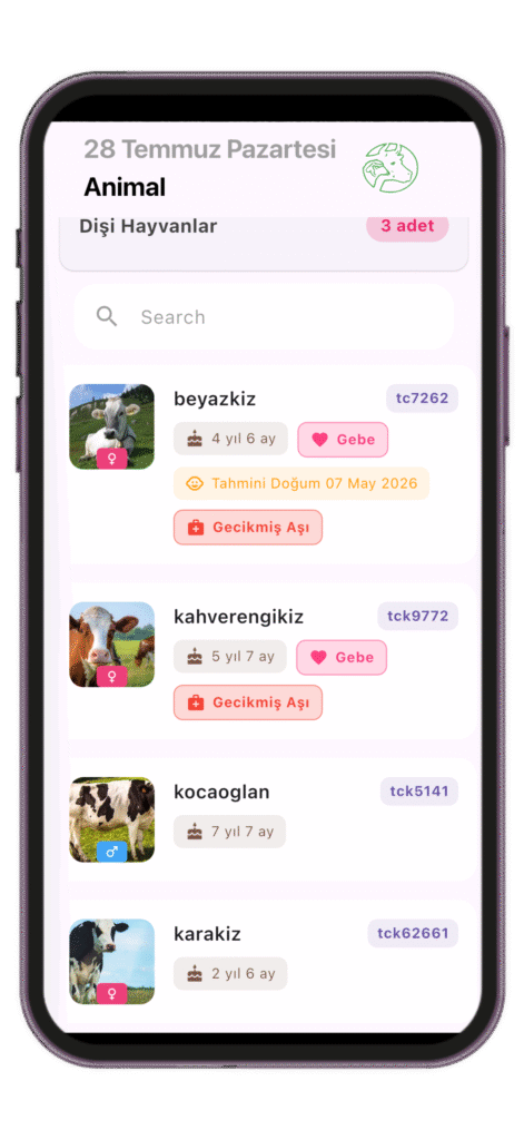 Çiftçilere, hayvanlarına uygulaması gereken aşılar, kontroller, doğum bilgileri ve sürülerin soy ağaçlarını takip etme imkanı sunar. Aynı zamanda veteriner hekimlerin yönlendirmelerini kolayca alarak, hastalık takibi ve bakım süreçlerini profesyonel bir şekilde yönetmelerini sağlar.
